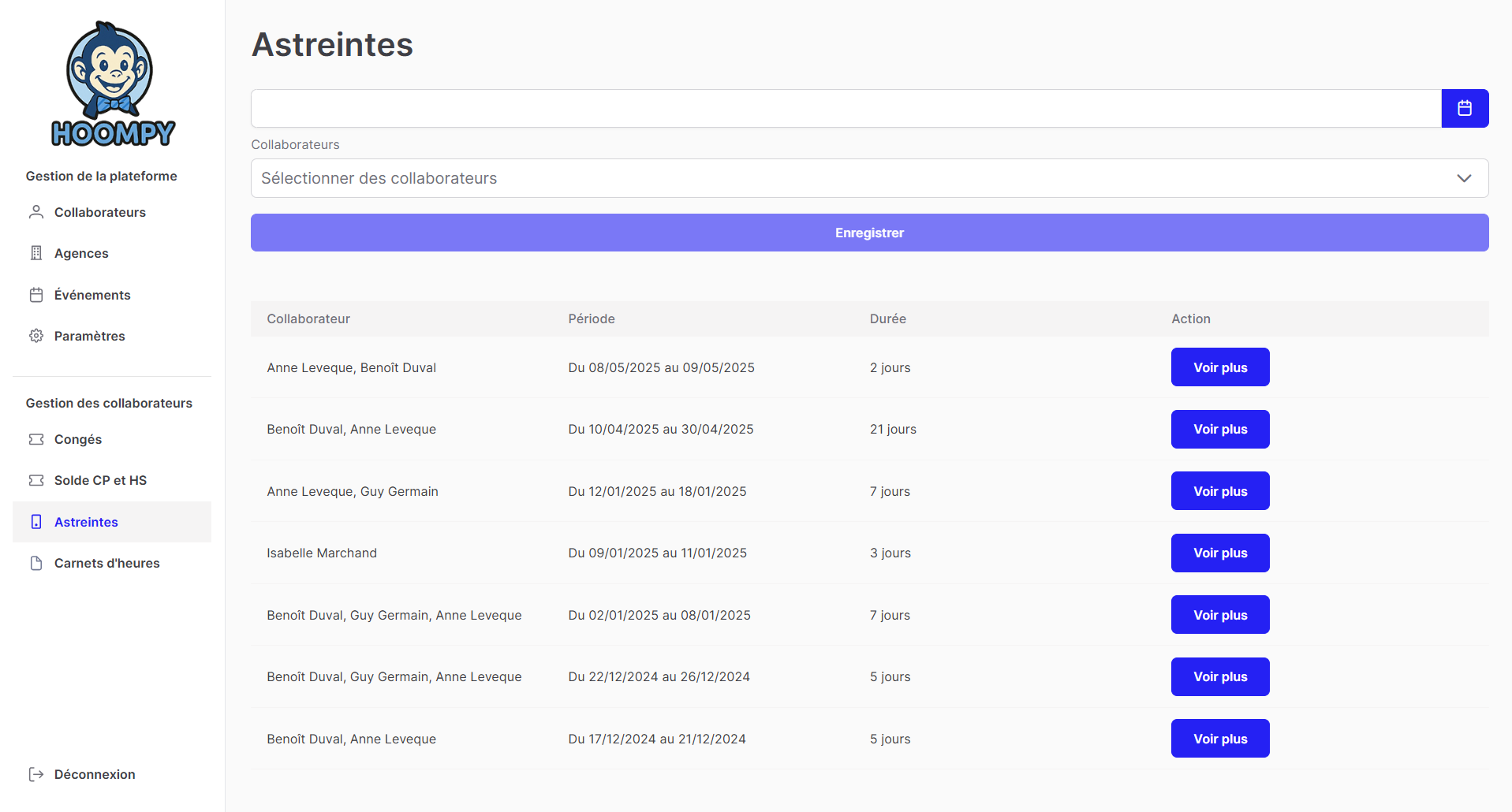 Gérer une maison funéraire ou une agence nécessite une organisation irréprochable. Hoompy rassemble en un seul espace toutes les fonctionnalités nécessaires à la gestion RH, du planning des interventions à la préparation de la paie. La centralisation des données offre une vision claire, évite les oublis et permet de réagir rapidement face aux imprévus.